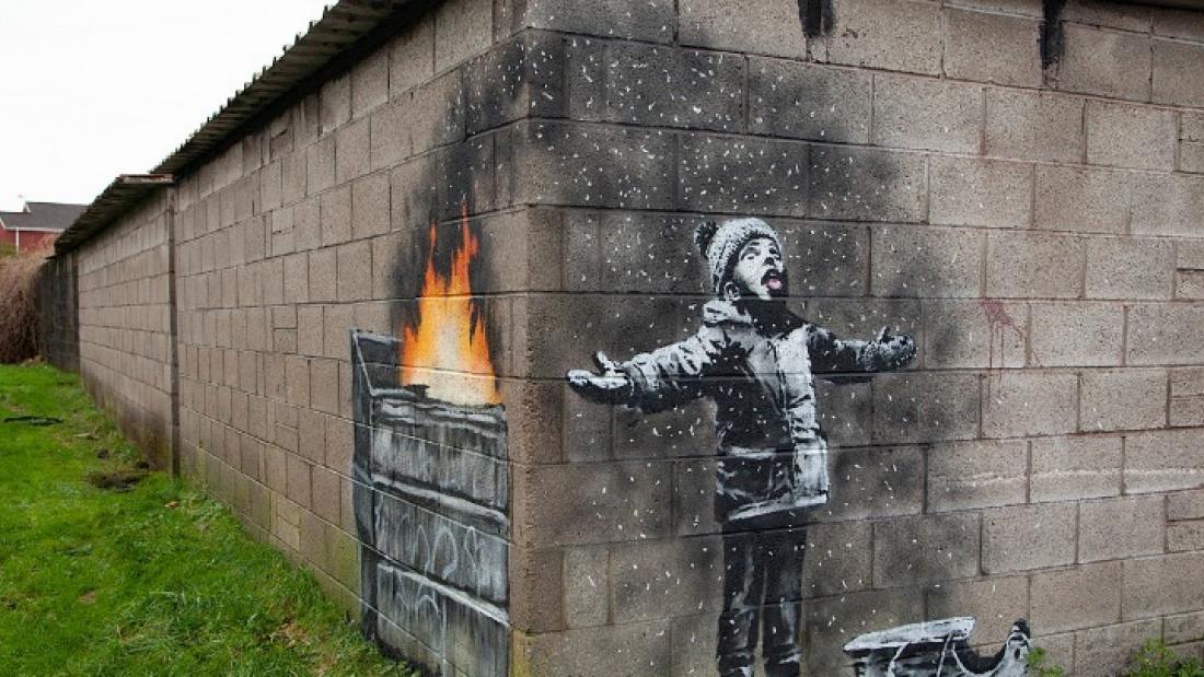 Το έργο τοποθετήθηκε σε δύο τοίχους ενός γκαράζ από τσιμεντόλιθους, που κάνουν γωνία: ένα αγοράκι το οποίο φοράει χειμωνιάτικα και έχει ένα μικρό έλκηθρο στα πόδια του, τεντώνει τα χέρια του και με τη γλωσσίτσα του προσπαθεί να πιάσει κάποιες νιφάδες που δείχνουν να είναι νιφάδες χιονιού. Αν ο θεατής πισωπατήσει, θα δει στον διπλανό τοίχο ότι αυτές οι «νιφάδες» δεν είναι παρά στάχτες από έναν κάδο σκουπιδιών που έχει πάρει φωτιά.