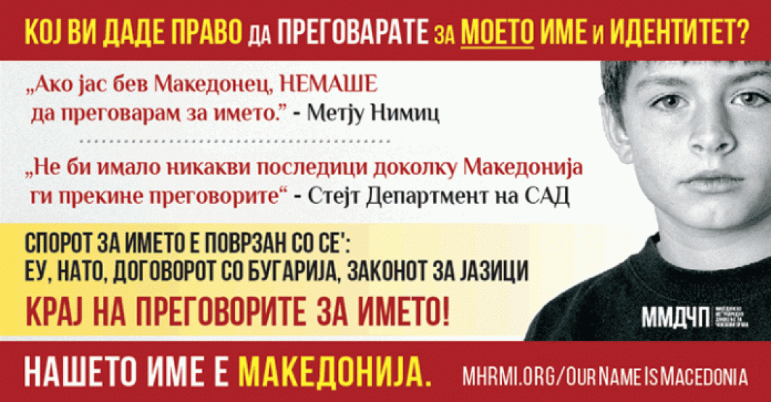Ονομασία ΠΓΔΜ: Σάλος έχει προκληθεί στο αποκαλούμενο «“Macedonian” Human Rights Movement International» – “MHRMI” (σ.σ. πρόκειται για ακραία εθνικιστική οργάνωση της διασποράς των Σκοπίων με έδρα το Τορόντο), το οποίο συνεχίζει την εκστρατεία του με γενικό τίτλο «Το όνομά μας είναι “Μακεδονία”», μετά τις τελευταίες ενέργειες για την εξεύρεση ονόματος!