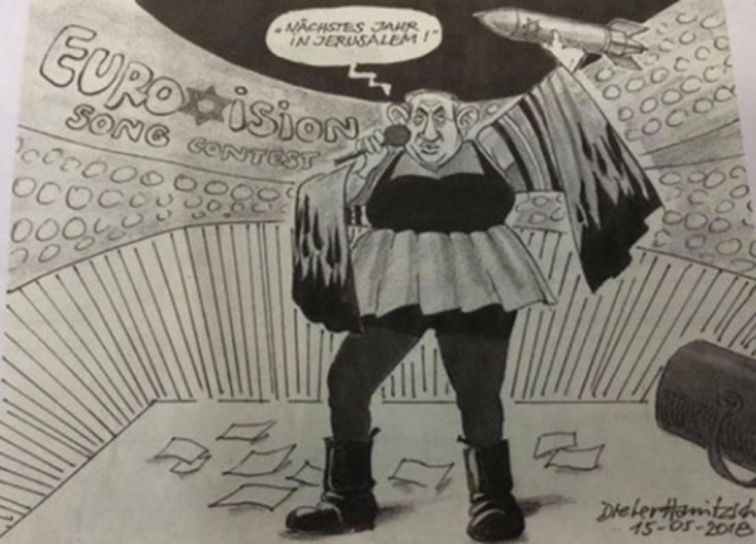 Στη γελοιογραφία παρουσιάζεται ο πρωθυπουργός του Ισραήλ. Μπέντζαμιν Ντανιάχου, ντυμένος με το κοστούμι της νικήτριας του διαγωνισμού τραγουδιού της Eurovision, Νέτα Μπαρζιλάι, να χρησιμοποιεί την δική της φράση «Του χρόνου στην Ιερουσαλήμ», κρατώντας έναν πύραυλο, ενώ στην επιγραφή «Eurovision» το «v» έχει αντικατασταθεί από το εβραϊκό σύμβολο του αστεριού του Δαυίδ, το οποίο απεικονίζεται επίσης πάνω στον πύραυλο.