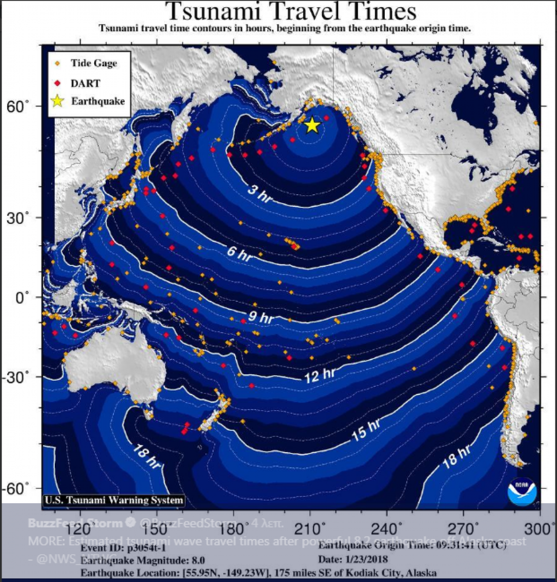 Συναγερμός για τσουνάμι έχει εκδοθεί για τις δυτικές ακτές των ΗΠΑ -την Καλιφόρνια, το Όρεγκον και τμήμα της Πολιτείας της Ουάσιγκτον-. Στη Χαβάη ήρθη ο συναγερμός.