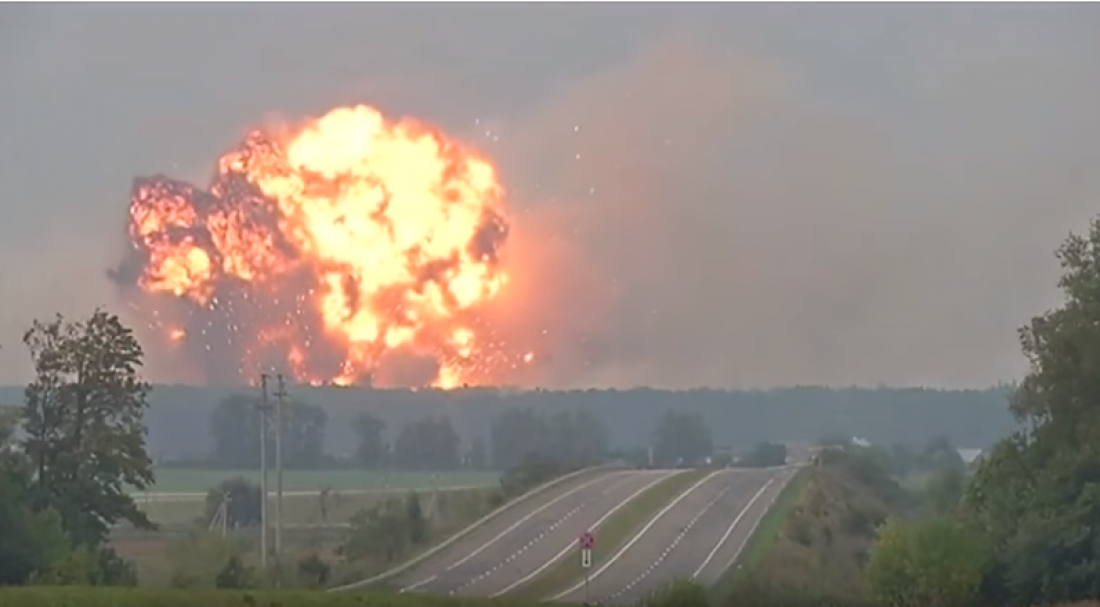 Σε απόσταση 270 χλμ δυτικά του Κιέβου στη βάση που βρίσκεται κοντά στην Καλίνιβκα της περιοχής Βινίτσια, δυνατές εκρήξεις έσπασαν την ησυχία του απογεύματος με την φωτιά να χρωματίζει τον ουρανό και να σπέρνει φόβο στους κατοίκους.