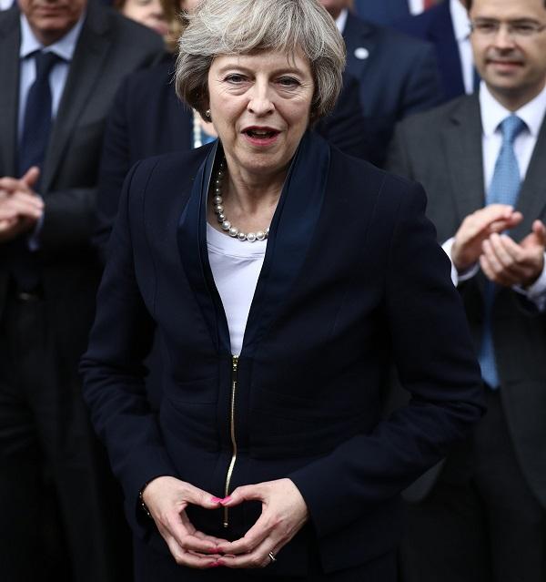 Η Βρετανή πρωθυπουργός απαθανατίστηκε να κάνει τρίγωνο με τα δάχτυλά της, πιέζοντας τους αντίχειρές της και κρατώντας τους δείκτες της μαζί, σαν σχήμα πυραμίδας.