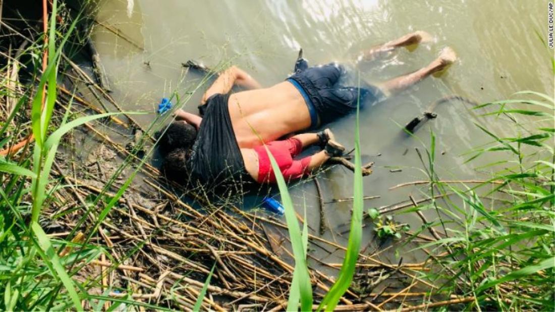 Η φωτογραφία τραβήχτηκε τη Δευτέρα και δείχνει τον 26χρονο Οσκαρ Αλμπέρτο Μαρτίνεζ Ραμίρεζ, από το Ελ Σαλβαδόρ, να κείτεται νεκρός στην όχθη του ποταμού Ρίο Γκράντε, στα σύνορα του Μεξικού με τις ΗΠΑ, από την πλευρά του Μεξικού. Δίπλα του, το άψυχο κορμάκι της 23 μηνών κόρης του, Βαλέρια, που τον έχει αγκαλιάσει με το ένα χεράκι της. Το χέρι της μικρής Βαλέρια είναι περασμένο μέσα από τη μπλούζα του μπαμπά της, τον οποίο κρατούσε από τους ώμους προφανώς για να καταφέρουν να διασχίσουν το ποτάμι.