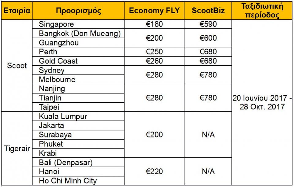 Στο πλαίσιο του λανσαρίσματος, η Scoot εξασφάλισε ακόμα πιο ελκυστικούς ναύλους απλής μετάβασης από την Αθήνα προς τη Σιγκαπούρη και προς προορισμούς της Αυστραλίας και επιλεγμένων χωρών της Νοτιοανατολικής Ασίας (ακολουθεί πλήρης κατάλογος) από €180 για την Οικονομική θέση και €590 για τη ScootBiz.