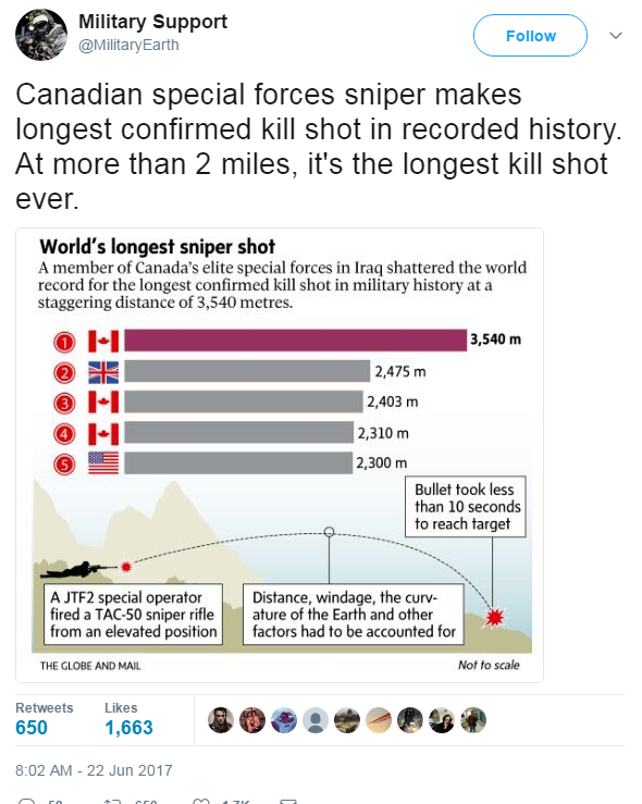 Η σφαίρα χρειάστηκε 10 δευτερόλεπτα για να φτάσει στον στόχο της. Όπως αναφέρεται σε δημοσίευμα της καναδικής The Globe and Mail, οι καναδικές ένοπλες δυνάμεις επιβεβαίωσαν την Πέμπτη πως ένα μέλος της Joint Task Force 2 προέβη στη συγκεκριμένη βολή κατά τη διάρκεια επιχείρησης στο Ιράκ τον προηγούμενο μήνα.