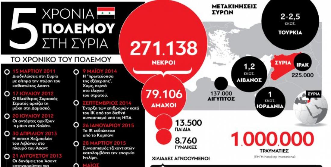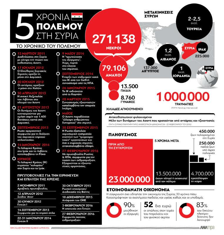 Απολογισμό των τραγικών απωλειών σε ανθρώπινες ζωές στον πληθυσμό της Συρίας καθώς και τις επιπτώσεις στην οικονομία της χώρας κάνει το ΑΠΕ με γράφημά του. Περιλαμβάνει επίσης χρονολόγιο των σημαντικότερων ημερομηνιών και των άκαρπων διπλωματικών προσπαθειών ειρήνευσης από την έναρξη του πολέμου την 15 Μαρτίου 2011 έως σήμερα.