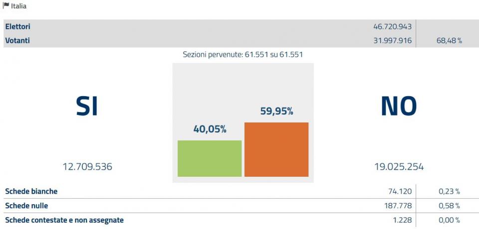 Αποτελέσματα ιταλικού δημοψηφίσματος: 40,89% το «Ναι», 59,12 το «Οχι»