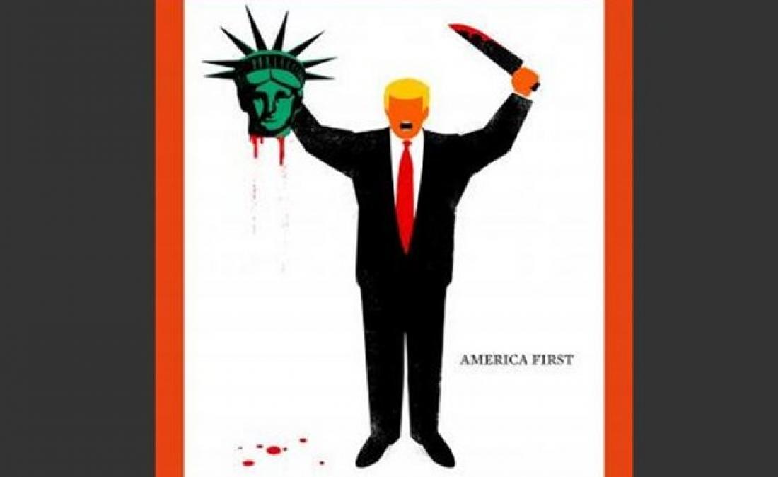 Ο πρόεδρος Ντ. Τραμπ απεικονίζεται εδώ σαν τρομοκράτης του Ισλαμικού Κράτους. Είναι σαφές ότι το εβδομαδιαίο περιοδικό Der Spiegel θέλει να προκαλέσει με το εξώφυλλο του νέου του τεύχους και δανείζεται γι αυτό την αισθητική του γαλλικού σατιρικού περιοδικού Charlie Hebdo ή του γερμανικού Titanic, σχολιάζει η Deutsche Welle.