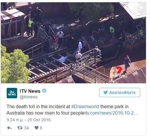 Τέσσερις άνθρωποι σκοτώθηκαν σήμερα στο πάρκο αναψυχής Dreamworld στην Χρυσή Ακτή της Αυστραλίας, στην τουριστική περιοχή του βορειοανατολικού κρατίδιο Κουίνσλαντ της Αυστραλίας, ανακοίνωσε η αστυνομία στο λογαριασμό της στο Twitter.