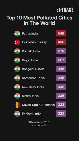 Η πρωτεύουσα Νέο Δελχί, ως συνήθως, βρίσκεται στην κορυφή. Ο δείκτης ποιότητας του ατμοσφαιρικού αέρα (AQI) διαμορφώθηκε στο 420, γεγονός που τοποθετεί την πόλη στην κατηγορία «επικίνδυνη», σύμφωνα με τον ελβετικό όμιλο IQAir.