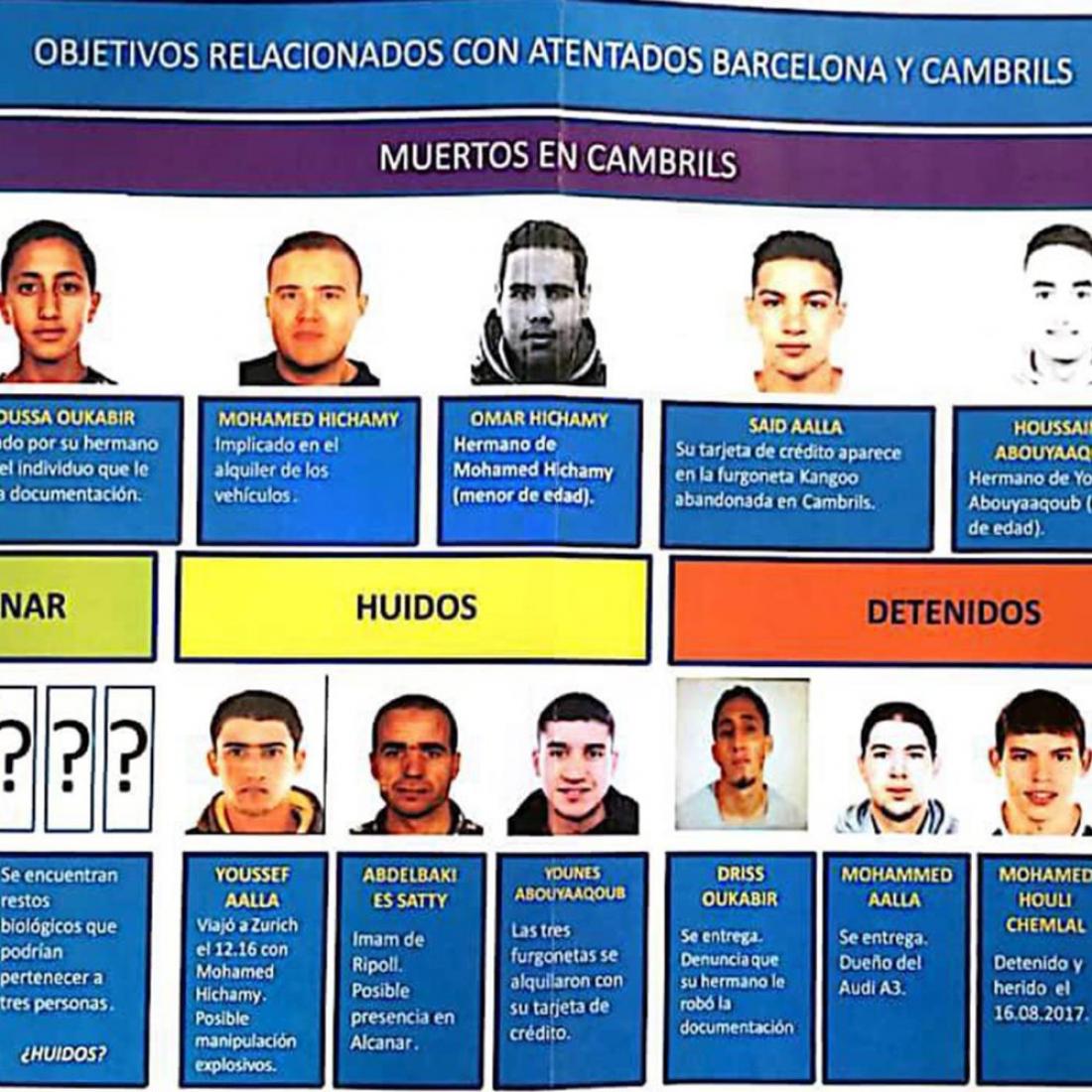 «Το νέο εύρημα ανοίγει μια νέα "γραμμή" ερευνών. Η αστυνομία τώρα διεξάγει έρευνες για τρεις ανθρώπους που διαφεύγουν, τον Γιουνές Αμπουγιακούμπ τον φερόμενο ως οδηγό του λευκού βαν που σκότωσε 13 στη Βαρκελώνη, τον Αμπντελμπακί Ες Σάτι, τον ιμάμη που φέρεται να αποτέλεσε τον «εγκέφαλο» των επιθέσεων, κα τον Γιουσέφ Ααλάα, τον αδερφό ενός εκ των τζιχαντιστών που έπεσαν νεκροί στην Καμπρίλς.