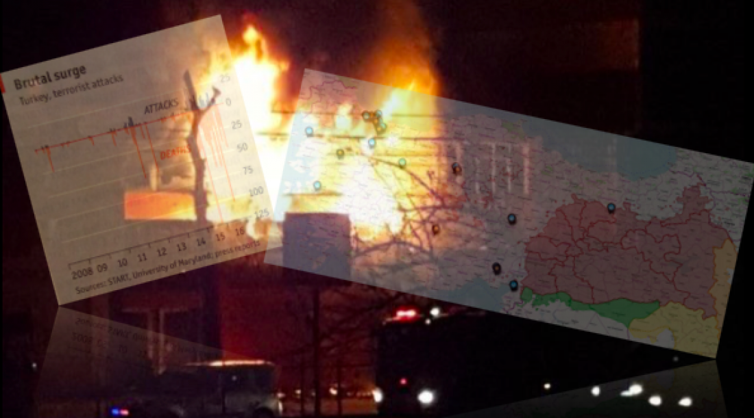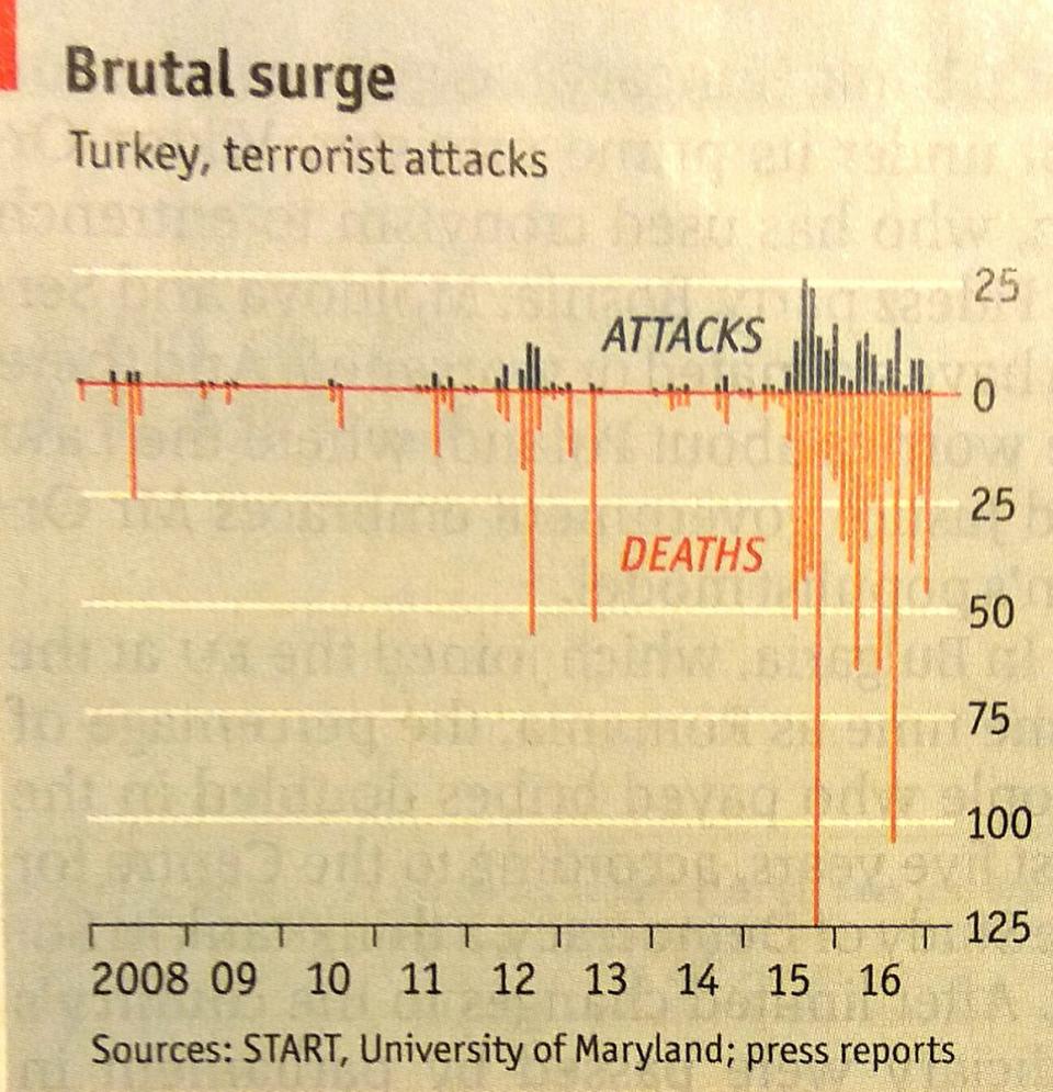 Στο γράφημα προκύπτει μια συσχέτιση της "απληστίας" του Ερντογάν να γίνει "πρόεδρος-αυτοκράτορας", με την αύξηση των βομβιστικών επιθέσεων και των θυμάτων που αυτές προκαλούν. Να ΄ναι απλά σύμπτωση,ότι από το 2015 που ξεκίνησε η προσπάθεια Ερντογάν να συγκεντρώσει όλες τις εξουσίες στα χέρια του, αυξήθηκαν και οι πολύνεκρες βομβιστικές επιθέσεις.