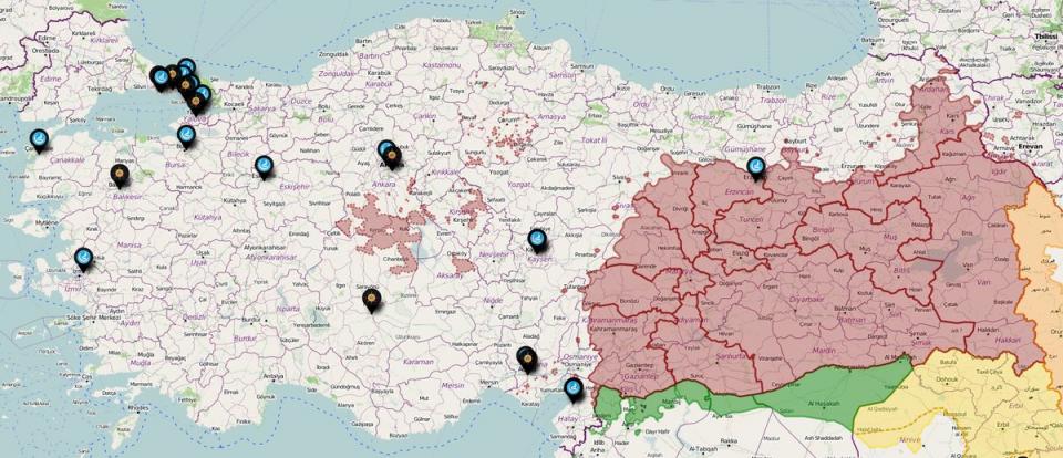 Στον χάρτη οι περιοχές που από χθες τουρκικός όχλος, πιστοί του Ερντογάν και ακροδεξιοί , ξεχύθηκαν στους δρόμους και επιτέθηκαν σε γραφεία του φιλοκουρδικού HDP, αλλά και σ΄ άλλους "στόχους" που έχουν σχέση με Κούρδους. "Νύχτα Κρυστάλλων" σαν κι αυτές που έκαναν οι , αλλά έχουν κάνει και οι Τούρκοι . Οι Έλληνες το γνωρίζουμε καλά.