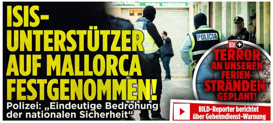 Στο πρωτοσέλιδο της Bild εξάλλου υπάρχει και το ρεπορτάζ για το «Τρόμο-αλέρτ» στην πρωτεύουσα της Μαγιόρκα, Πάλμα. Η ισπανική αστυνομία συνέλαβε έναν υποστηρικτή του τρομοκρατικού δικτύου ISIS στην πρωτεύουσα του νησιού των διακοπών, αναφέρει το δημοσίευμα.