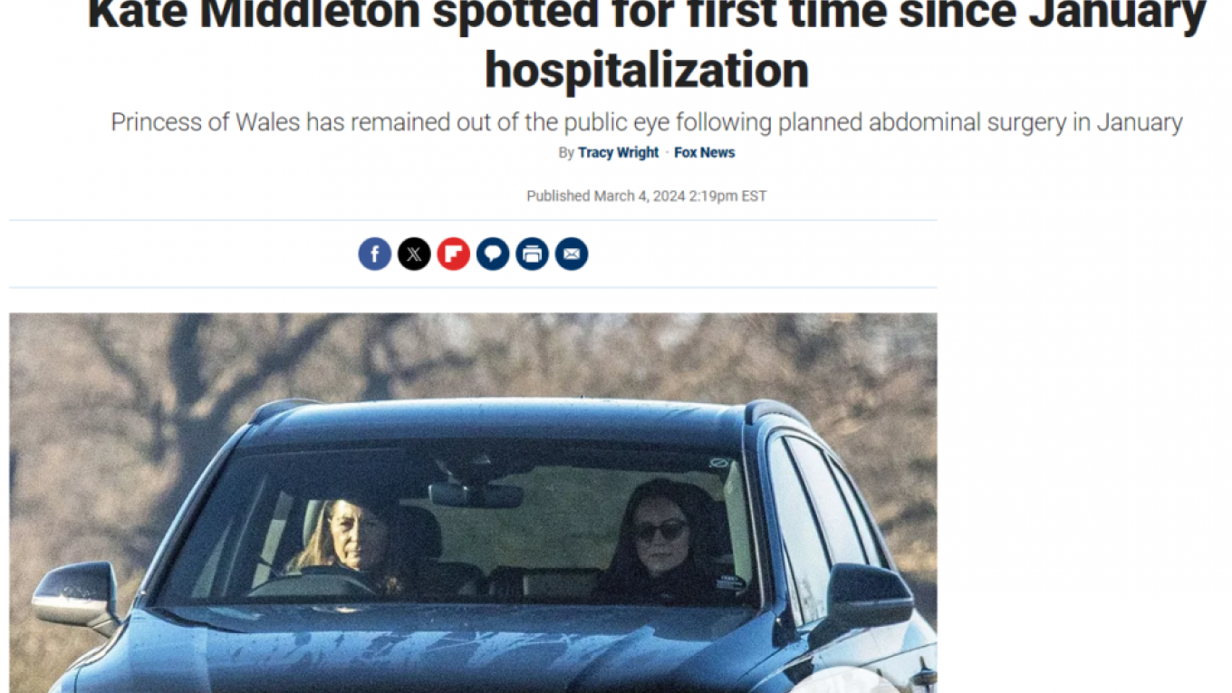 Σύμφωνα με το Fox News, η Κέιτ Μίντλετον φωτογραφήθηκε τη Δευτέρα κοντά στο κάστρο του Ουίνδσορ, στα περίχωρα του Λονδίνου. Καθόταν στη θέση του συνοδηγού του οχήματος που οδηγούσε η μητέρα της και φορούσε γυαλιά ηλίου.