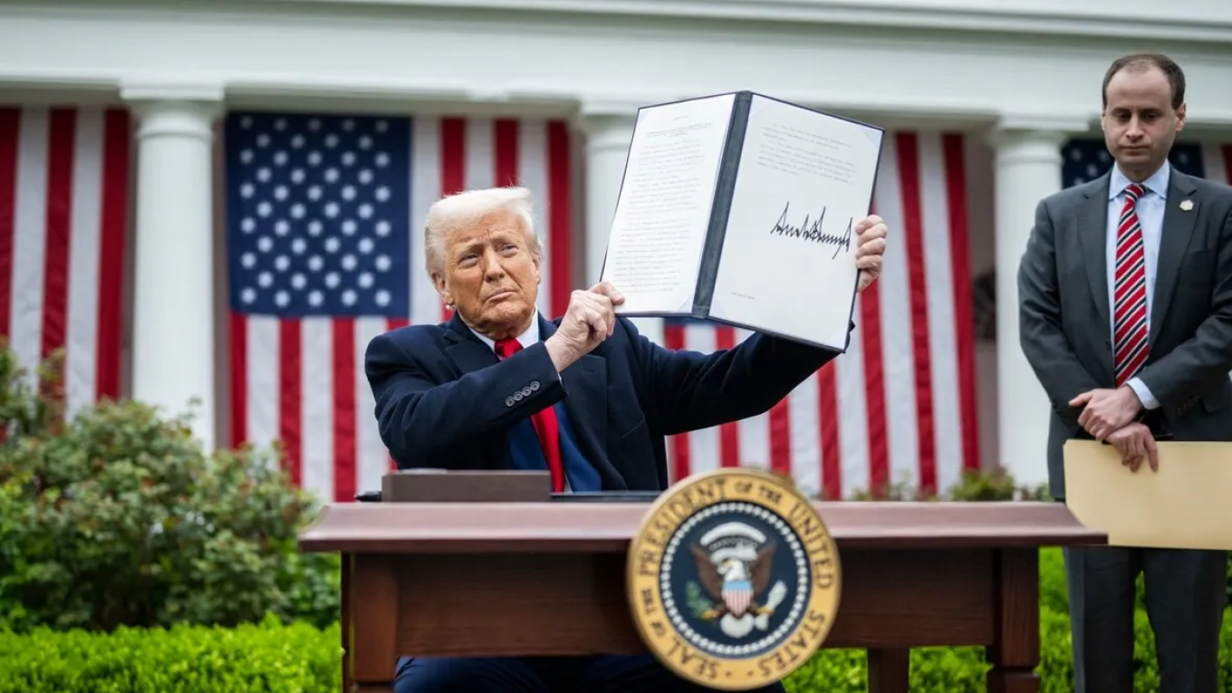 Από τον Κήπο των Ρόδων του Λευκού Οίκου, ο Ντόναλντ Τραμπ έκανε λόγο για «διακήρυξη οικονομικής ανεξαρτησίας», κρατώντας έναν πίνακα, στον οποίο αναγράφονταν αναλυτικά τα ποσοστά των δασμών για κάθε χώρα.