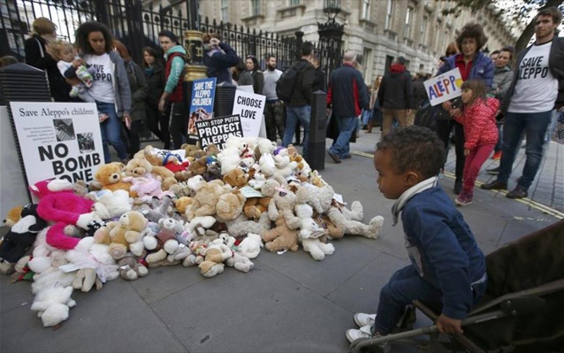 Δεκάδες Λονδρέζοι, μεταξύ των οποίων και η ηθοποιός Κάρεϊ Μάλιγκαν, άφησαν εκατοντάδες αρκουδάκια, που συμβολίζουν τα παιδιά του Χαλεπιού, κοντά στην πρωθυπουργική κατοικία, στον αριθμό 10 της Ντάουνινγκ Στριτ, λίγες ώρες πριν λήξει η κατάπαυση του πυρός στην πολιορκημένη πόλη.