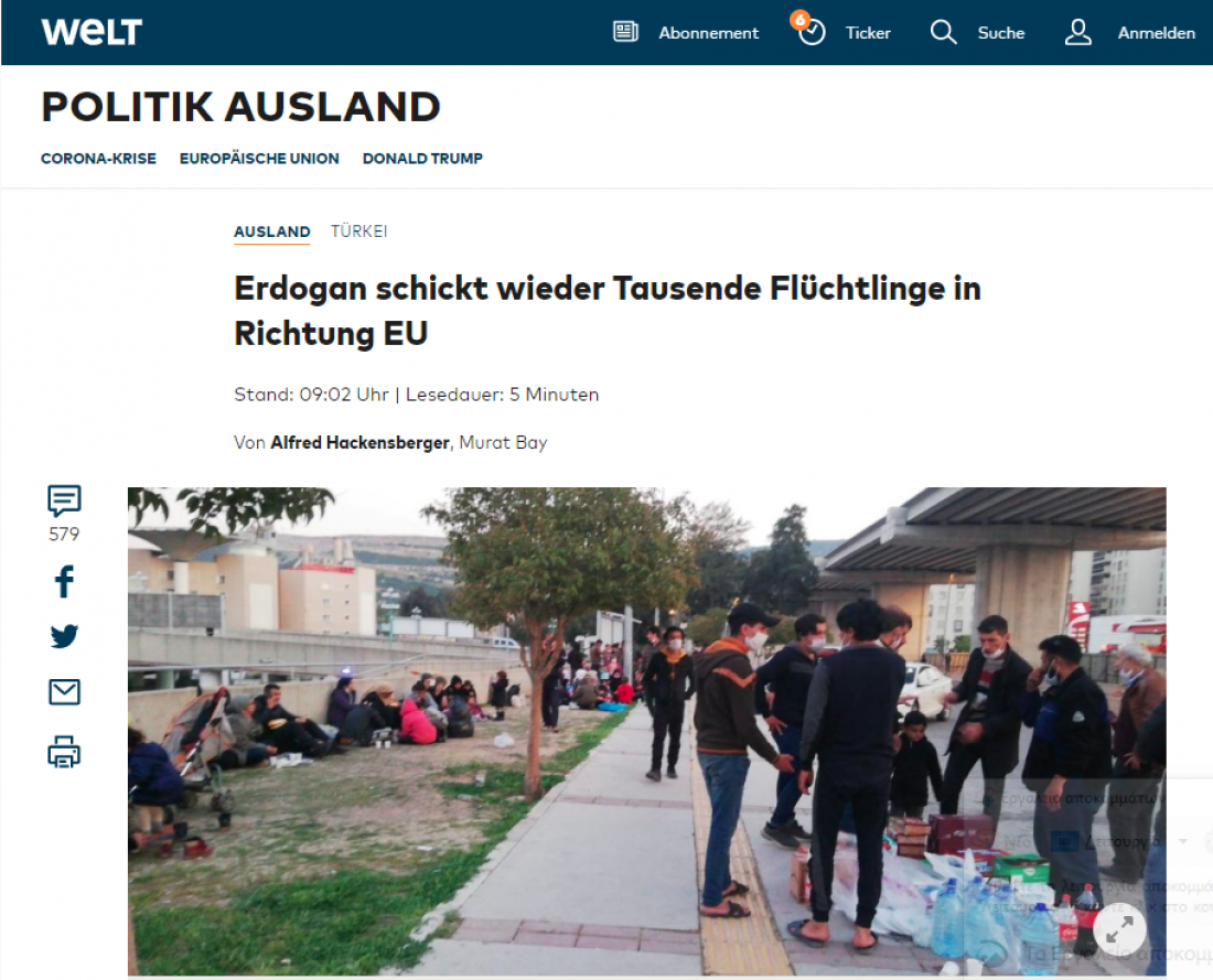 Η γερμανική εφημερίδα θυμίζει τις απειλές του υπουργού Εσωτερικών της Τουρκίας, Σουλεϊμάν Σοϊλού, ότι οι πρόσφυγες θα επανέλθουν στα ελληνικά σύνορα μόλις περάσει η επιδημία του κορωνοϊού και επισημαίνει ότι «η επιδημία μπορεί να μην έχει περάσει, αλλά φαίνεται ότι ο υπουργός Εσωτερικών θέλει να υλοποιήσει την απειλή του. Λεωφορεία μεταφέρουν δωρεάν τους μετανάστες στη Μεσόγειο, ώστε να μπουν στις βάρκες για ένα από τα ελληνικά νησιά. Με αυτό το νέο δρομολόγιο η Τουρκία επιχειρεί να ασκήσει πίεση στην ΕΕ. Πρόκειται για μία τακτική ανεύθυνη, η οποία με την πανδημία του κορωνοϊού γίνεται και εξαιρετικά επικίνδυνη».