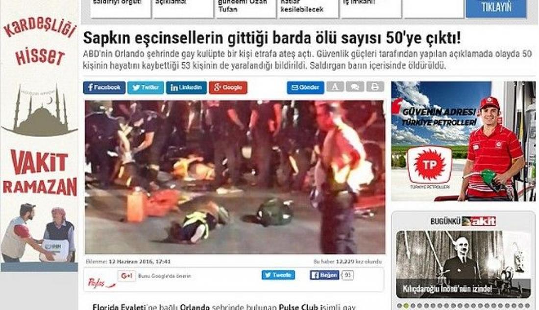 Η τουρκική εφημερίδα Yeni Akit, που υποστηρίζει ένθερμα τον πρόεδρο της Τουρκίας Ταγίπ Ερντογάν και τους... Τζιχαντιστές του ISIS, σε τίτλο της σε θέμα για το μακελειό στο Ορλάντο, χαρακτηρίζει τους νεκρούς, "διεστραμμένους" και "ανώμαλους", προκαλώντας έτσι σάλο και διεθνή κατακραυγή.