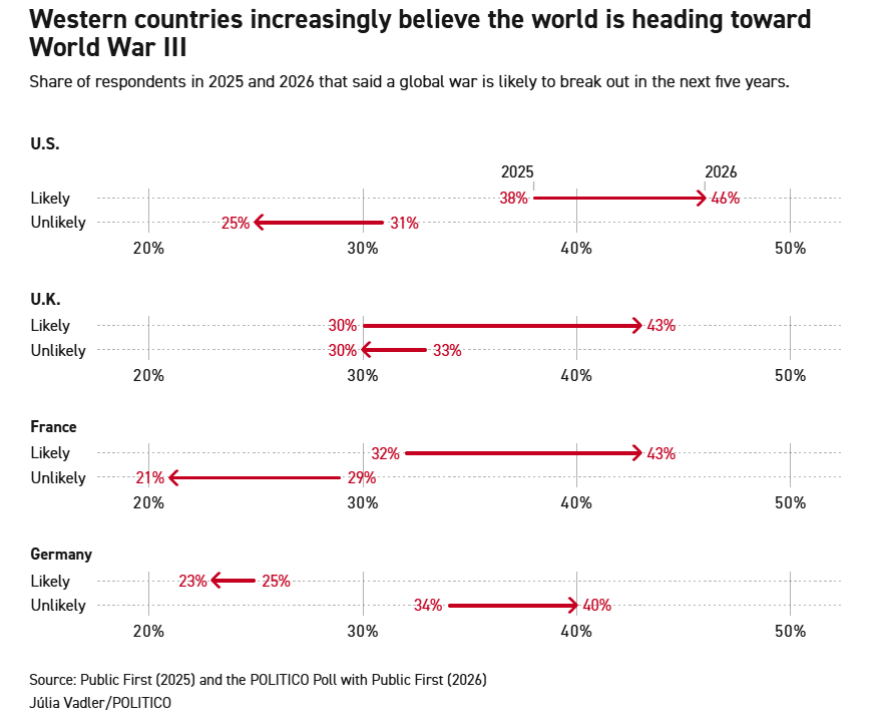 Την εκτίμηση ότι ο κόσμος οδεύει προς έναν Τρίτο Παγκόσμιο Πόλεμο διατυπώνει η πλειονότητα των πολιτών σε πέντε δυτικές χώρες, σύμφωνα με δημοσκόπηση που δημοσίευσε το Politico και διενήργησε η εταιρεία Public First.