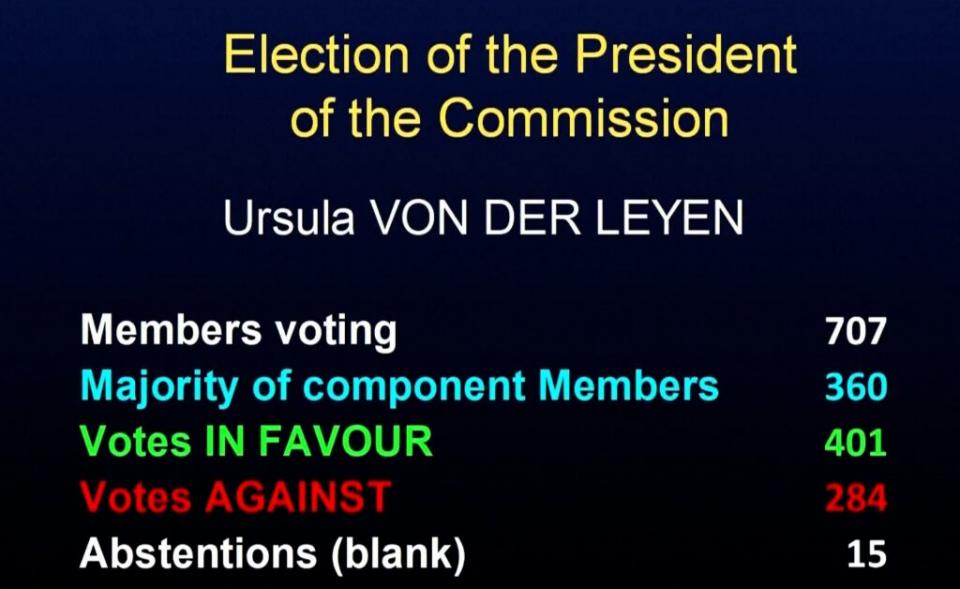 Η υποψηφιότητα της Ούρσουλα φον ντερ Λάιεν έλαβε 401 ψήφους - σημειώνεται πως χρειαζόταν κατ' ελάχιστον 361 ψήφους.