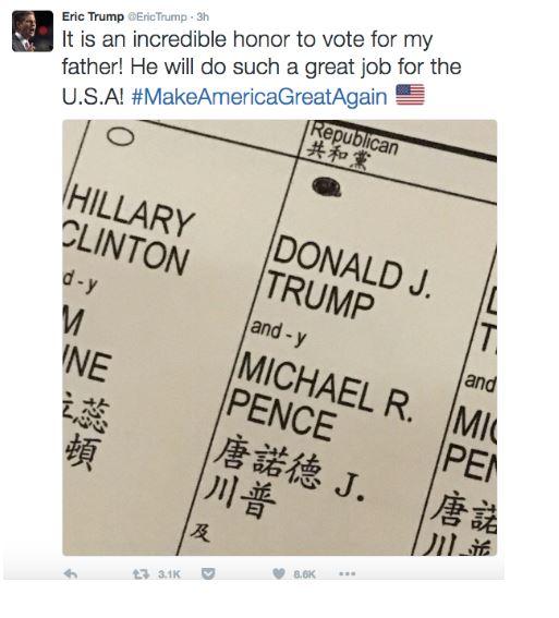 Η συγκεκριμένη φωτογραφία δείχνει την επιλογή του Έρικ Τραμπ η οποία όπως αναμενόταν ήταν υπέρ του πατρός Τραμπ κάτι το οποίο όμως με βάση τη νομοθεσία της Νέας Υόρκης είναι παράνομο.