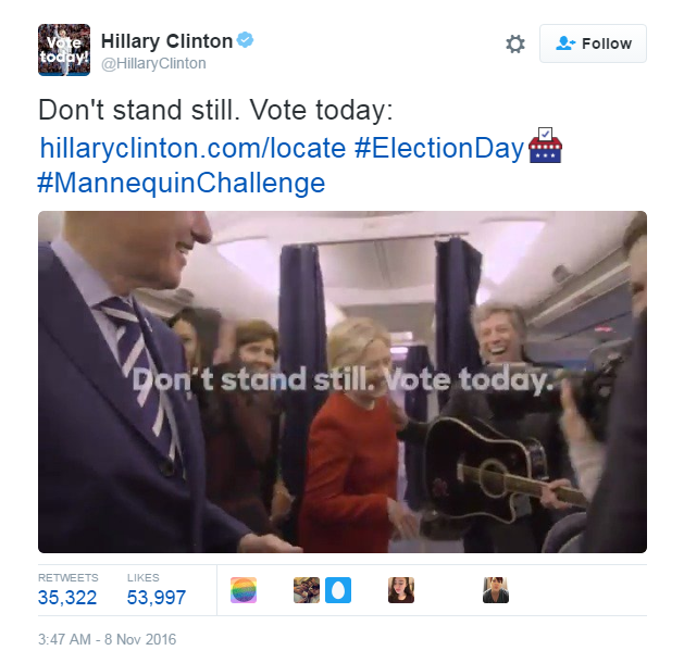 H Χίλαρι Κλίντον το πρωί της 8ης Νοεμβρίου, ανέβασε βίντεο στο Twitter με εκείνη και την ομάδα της να βιντεοσκοπούν το τελευταίο 'trend' στο διαδίκτυο, "Mannequin Challenge".