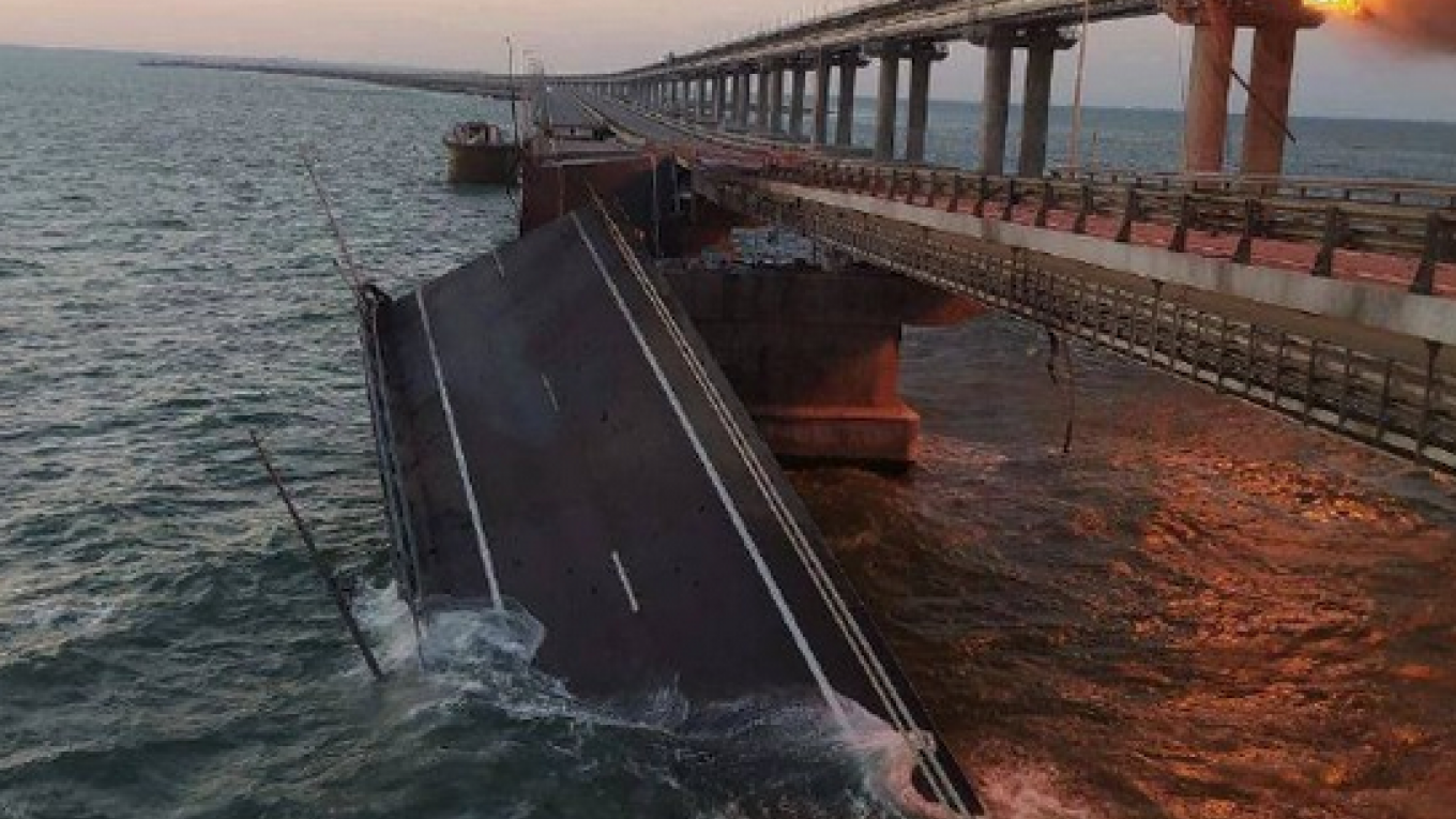 Νωρίς σήμερα το πρωί, ένα συγκλονιστικό βίντεο από την έκρηξη στη γέφυρα του Κερτς δόθηκε στη δημοσιότητα. Όπως φαίνεται από τις εικόνες, οι ζημιές στη γέφυρα είναι εκτεταμένες. Ο ένας οδικός διάδρομος της γέφυρας καταστράφηκε ολοσχερώς από την έκρηξη του παγιδευμένου με εκρηκτικά φορτηγού και έπεσε στη θάλασσα, ενώ ζημιές, αλλά σαφώς μικρότερες, υπάρχουν και στο σιδηροδρομικό δίκτυο.