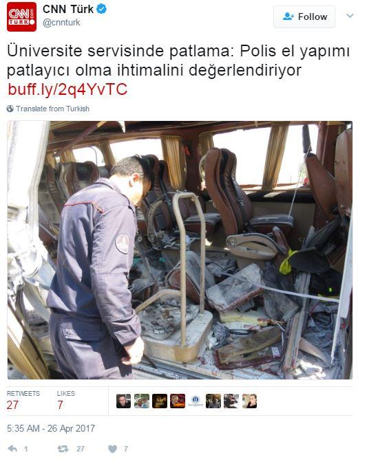 Σύμφωνα με το CNN Turk, η αστυνομία κάνει λόγο για αυτοσχέδιο εκρηκτικό μηχανισμό ενώ για τα αίτια της επίθεσης εξετάζονται όλα τα ενδεχόμενα.