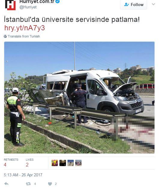 Με τα αίτια της έκρηξης να μην είναι ακόμα γνωστά, το ιδιωτικό πρακτορείο Dogan μεταδίδει ότι επτά άτομα έχουν τραυματιστεί, ενώ φωτογραφίες από το σημείο δείχνουν το όχημα να έχει υποστεί σοβαρές ζημιές.