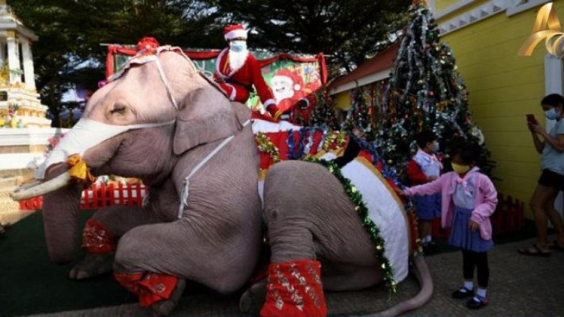 Ελέφαντες στην Ταϊλάνδη φορώντας σκούφους του Άγιου Βασίλη και χειρουργικές μάσκες μοίρασαν απολυμαντικό τζελ, μάσκες προσώπου και μπαλόνια σε μαθητές σε ετήσια σχολική γιορτή για τα Χριστούγεννα, με την 15ετη αυτή παράδοση στην κυρίως βουδιστική χώρα να προσαρμόζεται στην εποχή της COVID-19.