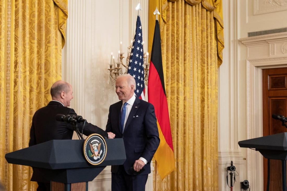 Τις τελευταίες ημέρες αμερικανικά ΜΜΕ εξέφραζαν ενδοιασμούς για την στάση του Βερολίνου, καθώς η γερμανική κυβέρνηση αρνείται να προμηθεύσει «όπλα επιθετικού χαρακτήρα» στην Ουκρανία και επιπλέον δεν διασαφηνίζει τη στάση της για τον αγωγό φυσικού αερίου Nord Stream 2, που έχει κατασκευαστεί προκειμένου να μεταφέρει φυσικό αέριο από τη Ρωσία στην βόρεια Γερμανία, παρακάμπτοντας την Ουκρανία. Στην κοινή συνέντευξη Τύπου Μπάιντεν-Σολτς ακούστηκε για πρώτη φορά ευθέως η απειλή, ότι μία ρωσική εισβολή στην Ουκρανία θα σημάνει το τέλος του Nord Stream 2, μόνο που την απειλή αυτή δεν εκστόμισε ο καθ' ύλην αρμόδιος Όλαφ Σολτς, αλλά ο Τζο Μπάιντεν. «Εάν εισβάλει η Ρωσία στην Ουκρανία, είτε με στρατό, είτε με τεθωρακισμένα, δεν θα υπάρχει πλέον Nord Stream 2, θα το τερματίσουμε», ανέφερε χαρακτηριστικά ο αμερικανός πρόεδρος. «Μα πώς θα γίνει αυτό, αφού το project είναι υπό γερμανικό έλεγχο…» απορεί μία δημοσιογράφος. Η απάντηση του Μπάιντεν είναι ξεκάθαρη: «Θα το κάνουμε. Σας υπόσχομαι ότι μπορούμε να το κάνουμε».