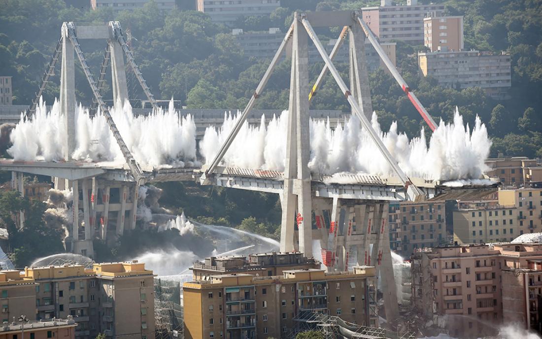 Οι δύο κύριοι πυλώνες που είχαν απομένει από τη γέφυρα της Γένοβας κατεδαφίστηκαν με ελεγχόμενη έκρηξη, ώστε να επιτραπεί η ανέγερση μιας νέας δομής.