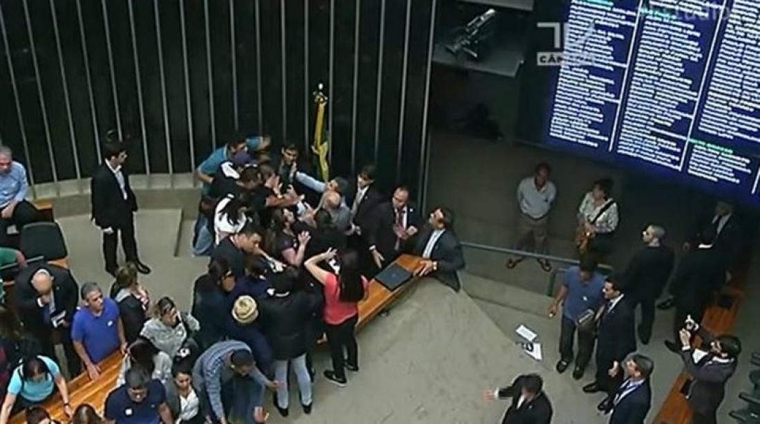 Περίπου 60 αντικυβερνητικοί διαδηλωτές αποπειράθηκαν σήμερα να κάνουν κατάληψη στην κεντρική αίθουσα της κάτω Βουλής του βραζιλιάνικου Κογκρέσου κι επικράτησε χαοτική κατάσταση, καθώς φρουροί προσπάθησαν να τους σύρουν έξω από τον χώρο όπου συνήθως βρίσκονται ο πρόεδρος του σώματος και κοινοβουλευτικοί.
