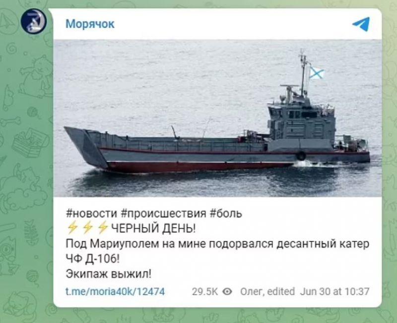 Συγκεκριμένα, πλοίο του πολεμικού ναυτικού...βυθίστηκε όταν προσέκρουσε σε ρωσική νάρκη στη ανοιχτά στη θάλασσα της Μαριούπολης. Σύμφωνα με πληροφορίες, τα μέλη του πληρώματος είναι όλοι καλά στην υγεία τους.