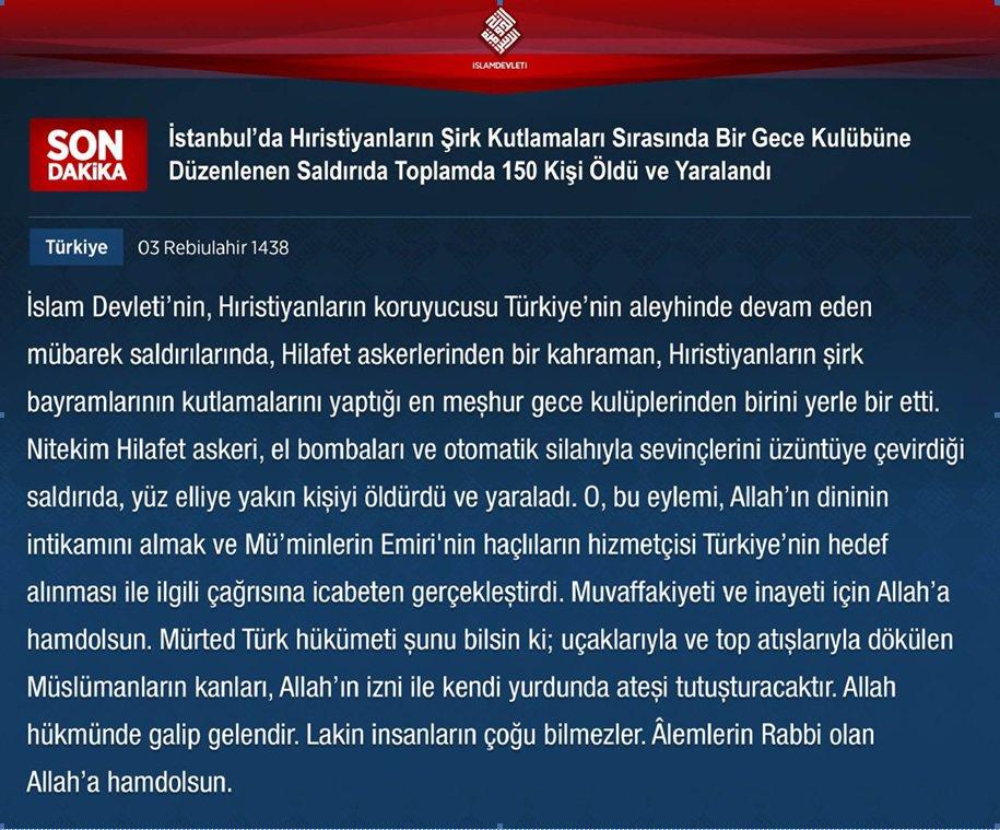 "Σε συνέχεια των ευλογημένων επιχειρήσεων που διαπράττει το Ισλαμικό Κράτος κατά του προστάτη του σταυρού, την Τουρκία, ένας ηρωϊκός στρατιώτης του χαλιφάτου έπληξε ένα από τα πιο γνωστά νυχτερινά κέντρα, όπου γιόρταζαν (για την Πρωτοχρονιά) χριστιανοί", αναφέρει η τζιχαντιστική οργάνωση στην ανακοίνωσή της.