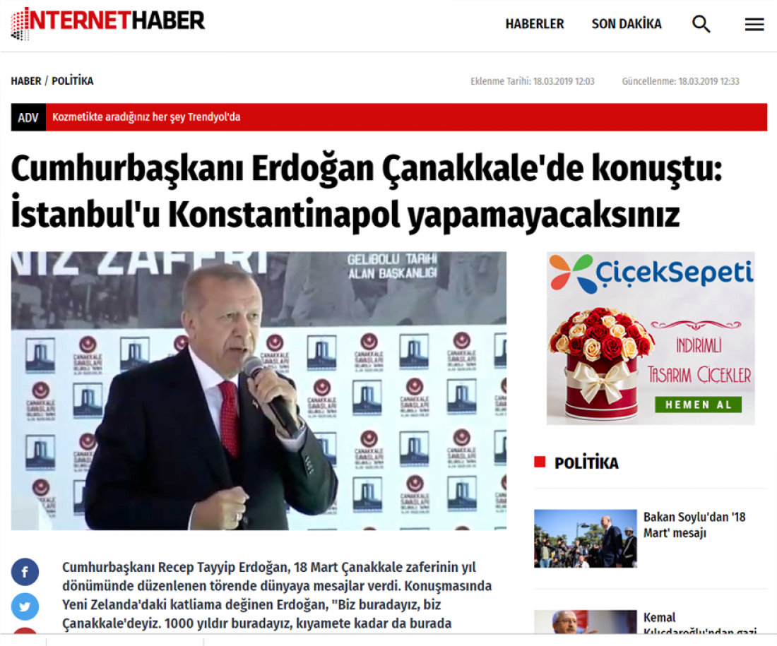 «Την Ιστανμπούλ δεν θα μπoρέσετε να την κάνετε ποτέ Κωνσταντινούπολη . Εμείς είμαστε εδώ και 1000 χρόνια. Όποιος επιχειρήσει να μας απομακρύνει από εδώ, θα φύγει με το φέρετρο του όπως το κάναμε στο παρελθόν» είπε σε ομιλία του στα Δαρδανέλλια ο Ρ.Τ. Ερντογάν, στη σκιά των αναφορών του μακελάρη της Νέας Ζηλανδίας Μπράντον Τάραντ ότι οι λευκοί θα εκδιώξουν τους Τούρκους από την Κωνσταντινούπολη.
