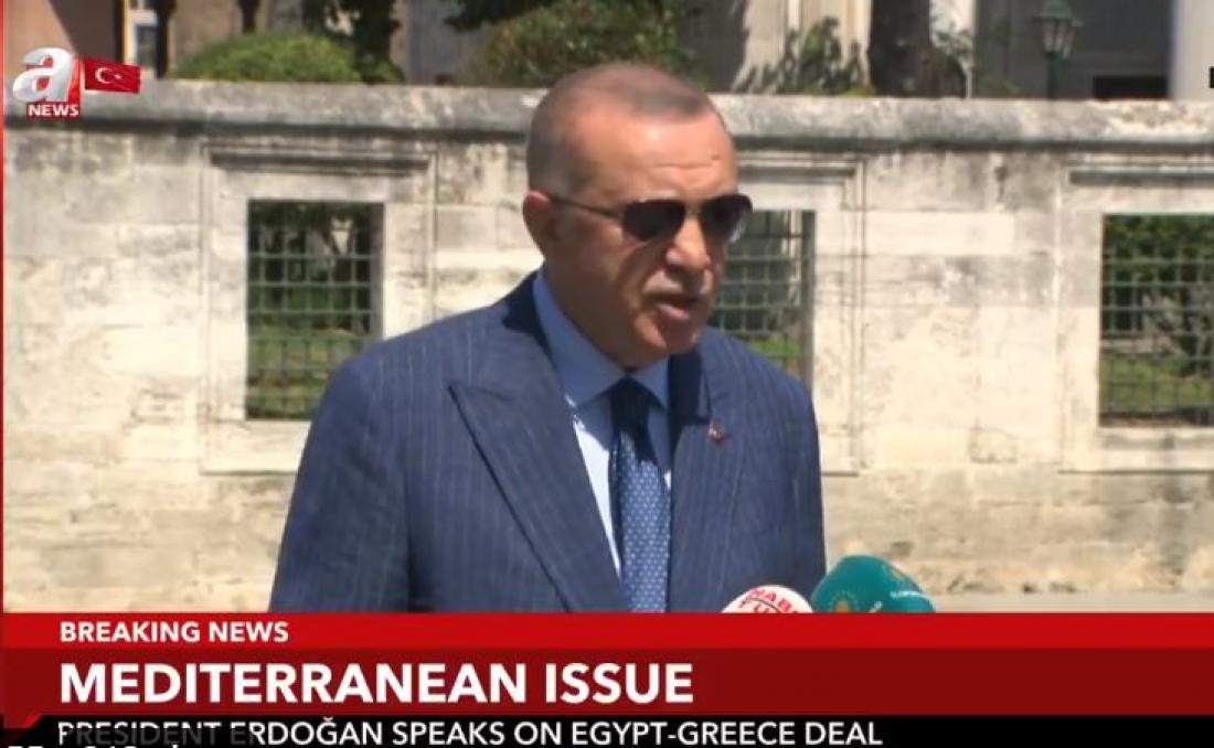 Μιλώντας σε δημοσιογράφους μετά την προσευχή της Παρασκευής στην Αγία Σοφία, ο Τούρκος πρόεδρος σημείωσε ότι εξαπατήθηκε από την Αθήνα και υπογράμμισε χαρακτηριστικά: «Δεν αναγνωρίζω τη συμφωνία, για εμάς είναι ανύπαρκτη η συμφωνία, η Ελλάδα δεν έχει καμία σχέση με τη Λιβύη ούτε με την Αίγυπτο».