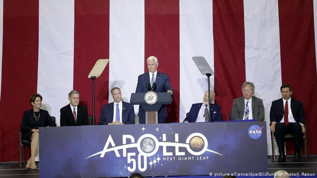 Με εμβατήρια υποδέχονται τον Μάικ Πενς στελέχη, αλλά και βετεράνοι της NASA στο διαστημικό κέντρο Κέιπ Κανάβεραλ της Φλόριντα. Στο ακροατήριο μεταξύ άλλων και ο Έντουιν Όλντριν, ένας από τους αστροναύτες που συμμετείχαν στην ιστορική αποστολή της NASA στο φεγγάρι, πριν από ακριβώς 50 χρόνια. "Θα επιστρέψουμε" λέει ο Αμερικανός αντιπρόεδρος. Οι εορτασμοί για την προσσελήνωση του 1969 και οι εξαγγελίες για νέες αποστολές δίνουν την ευκαιρία στον Μάικ Πενς να υπογραμμίσει τις ηγετικές φιλοδοξίες των ΗΠΑ στο διάστημα- και όχι μόνο.