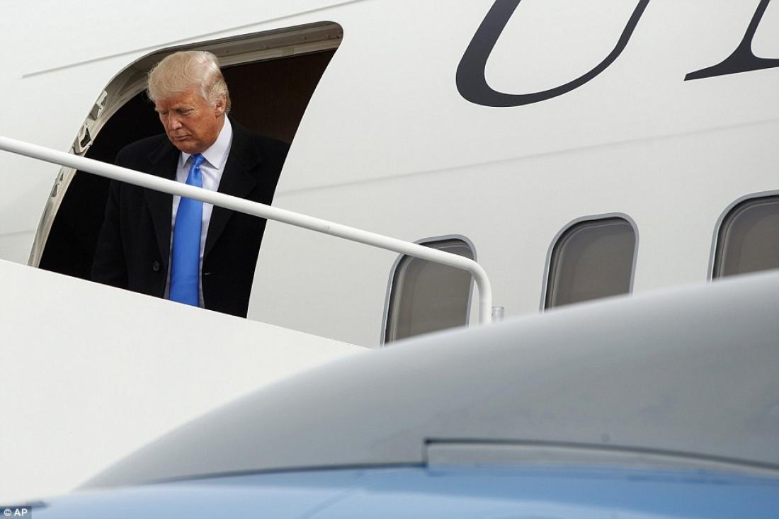 Φορώντας σκούρο κοστούμι και μπλε γραβάτα ο επόμενος πρόεδρος της Αμερικής αποβιβάστηκε από το αεροσκάφος μαζί με τη σύζυγό του Μελάνια, η οποία φόραγε γυαλιά ηλίου και ένα σκούρο παλτό. Μαζί τους ήταν και ο γιος τους Μπάρον.