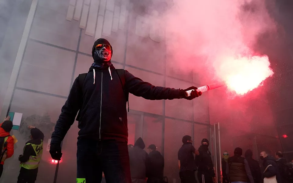 Κρατώντας τις σημαίες συνδικάτων, ομάδα μερικών εκατοντάδων διαδηλωτών κατέλαβε την είσοδο του Euronext και άναψε κόκκινες φωτοβολίδες φωνάζοντας το δημοφιλές σύνθημα: «Είμαστε εδώ, είμαστε εδώ, ακόμα κι αν ο Μακρόν δεν το θέλει, είμαστε εδώ.» Φώναξαν επίσης: «Μακρόν παραιτήσου!» Νωρίτερα αυτό το μήνα, παρόμοιες σκηνές σημειώθηκαν στα γραφεία της Blackrock στο Παρίσι.