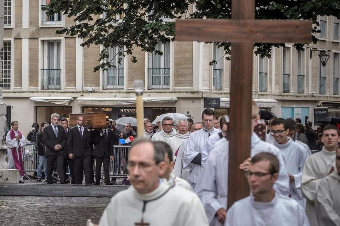 Υπό αυστηρά μέτρα ασφαλείας τελέστηκε η κηδεία του ιερέα που σφαγιάστηκε από τζιχαντιστές. «Ένας ιερέας δολοφονήθηκε από τρομοκράτες, έπρεπε να δώσουμε το παρών για να πούμε όχι» είπε ο Ζαν-Φρανσουά, ένας στρατιωτικός εν αποστρατεία, ηλικίας 72 ετών.