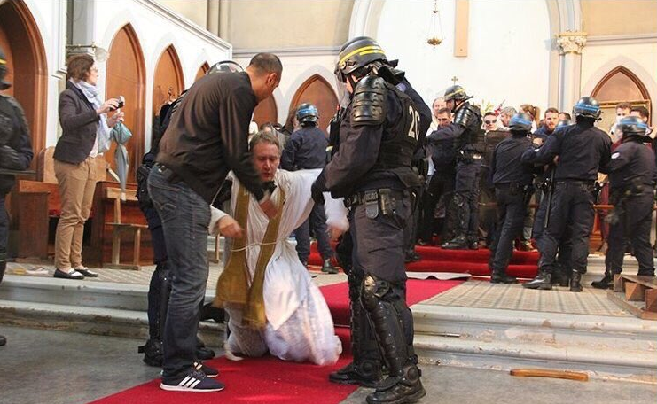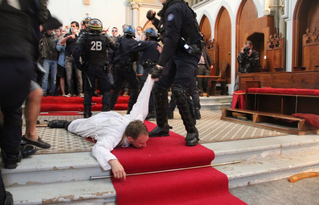 Αστυνομία εισέβαλε στην εκκλησία της Αγίας Ρίτας στο ήσυχο 15ο διαμέρισμα του Παρισιού για να απομακρύνει τους ιερείς και τους κατοίκους της περιοχής που πραγματοποιούσαν καθιστή διαμαρτυρία έξω και μέσα στην εκκλησία διαμαρτυρόμενοι για την προγραμματισμένη κατεδάφιση της.