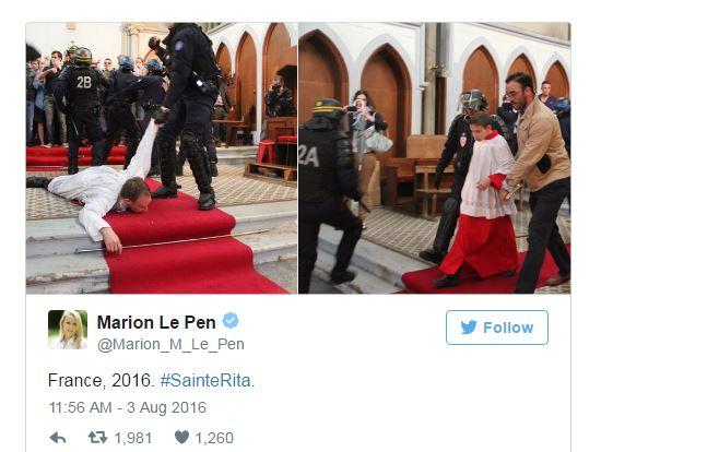 Η Μαρί Λε Πεν έγραψε στο Twitter: "Και αν φτιάξουμε χώρους στάθμευσης στα τεμένη των σαλαφιστών και όχι στις εκκλησίες μας;", ενώ η ανηψιά της Μαριόν Λε Πεν, το ανερχόμενο αστέρι του Εθνικού Μετώπου ανέβασε φωτογραφιες που δείχνουν τους αστυνομικούς να σέρνουν ιερέα και να απομακρύνουν ένα παπαδάκι, γράφοντας απλώς "Γαλλία 2016".