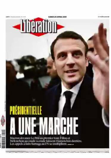 Με τον Μακρόν να τείνει το χέρι του στο εξώφυλλό της η «Liberation» γράφει για τον ανεξάρτητο υποψήφιο πρόεδρο της Γαλλίας: «Προεδρία, σε μία βόλτα» θέλοντας να δείξει πως παρά το γεγονός ότι ο Εμανουέλ Μακρόν είναι σχετικά άπειρος πολιτικά και δεν έχει εκλεγεί σε δημόσιο αξίωμα, με ευκολία κατάφερε να κερδίσει την πρωτιά στον πρώτο γύρο ενώ οδεύει με βήμα σταθερό προς το Μέγαρο των Ηλυσίων.