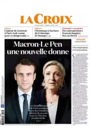 Η «Les Echos» με τον κεντρώο υποψήφιο και εκείνη στο πρωτοσέλιδό της γράφει: «Ο Μακρόν μπροστά από τη Λεπέν ενώ η «La Croix» δίνοντας χώρο και στους δύο υποψηφίους κάνει λόγο για μία «νέα συμφωνία».