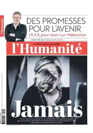 Ειδικά η «L'Humanité» βγαίνει με ένα τεράστιο «Jamais» (Ποτέ) και την με το κεφάλι σκυμμένο. Η ιστορική γαλλική εφημερίδα της Αριστεράς δίνει το στίγμα της για τον β' γύρο των γαλλικών εκλογών δείχνοντας στους ψηφοφόρους τον Εμανουέλ Μακρόν.