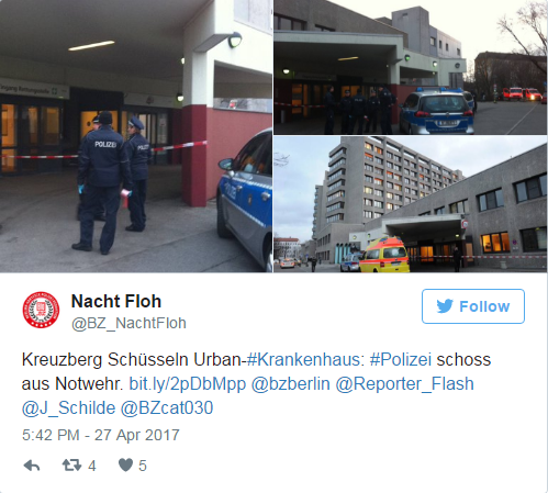 Πυρά ακούστηκαν πριν από λίγο σε ένα νοσοκομείο στη συνοικία Κρόιτσμπεργκ του Βερολίνου και η αστυνομία έχει αποκλείσει μια μεγάλη περιοχή γύρω από αυτό, ανέφερε σε ανάρτησή του στον ιστότοπο κοινωνικής δικτύωσης Twitter το γερμανικό δίκτυο RBB.