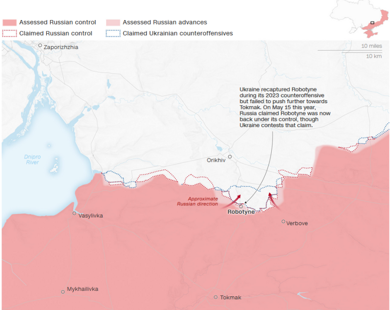 Το Robotyne, ένα μικροσκοπικό χωριό που τώρα έχει καταστραφεί ολοσχερώς, άλλαξε χέρια αρκετές φορές κατά τη διάρκεια του πολέμου. Καταλήφθηκε για πρώτη φορά από τις ρωσικές δυνάμεις στις αρχές Μαρτίου 2022 και η Μόσχα διεκδίκησε ξανά τον έλεγχό της νωρίτερα αυτόν τον μήνα, κάτι που διέψευσε η Ουκρανία.