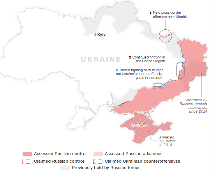 Πριν από την επίθεση στο Χάρκοβο, η Ρωσία είχε επικεντρώσει σε μεγάλο βαθμό τις επιθετικές της επιχειρήσεις στα ανατολικά. Η κατάληψη της ανατολικής βιομηχανικής ζώνης της Ουκρανίας, του Ντονμπάς, παραμένει ένας σημαντικός στόχος του Κρεμλίνου.